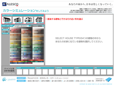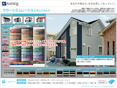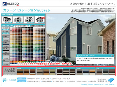 色の選び方や注意点の説明をみることができる親切なシミュレーションです。色の種類が日本塗料工業会の色見本と関西ペイントの標準色から選ぶことができるため、多くの色でシミュレーションすることができます。また、「ジャンル別おすすめ配色」という機能を使用することで、自動的に綺麗な配色に調整してくれます。http://www.kansai.co.jp/repaint/