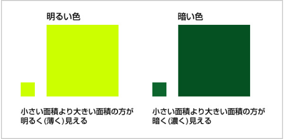 上記のように、同じ色を大きさの違うものにしたとき、明るい色は大きな面積の方が明るく見えます。反対に、暗い色は大きい面積の方が暗く見えます。