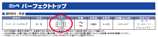 業者から塗料のカタログを受け取っている場合は、荷姿の項目に艶について記載がある場合があります。