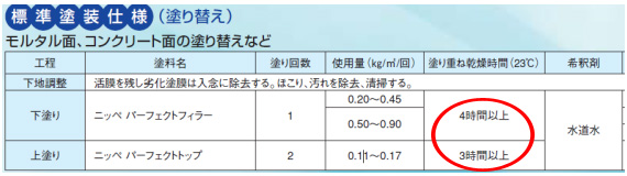 使用する塗料によっては、水性塗料(下塗り)の上に油性塗料(中上塗り)を塗っても問題はありません。同様に、油性塗料(下塗り)の上に水性塗料(中上塗り)を塗った場合も同様です。これらの条件は、塗料パンフレットの「塗装標準仕様」の欄に記載があります。